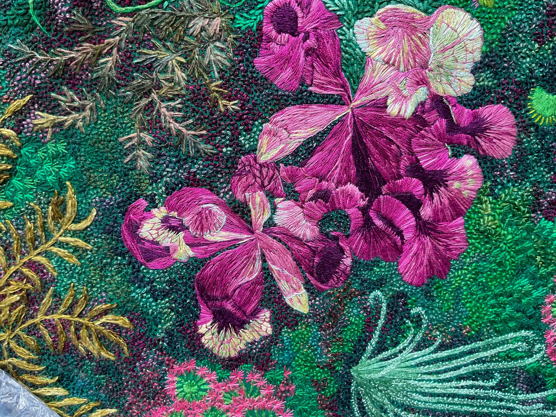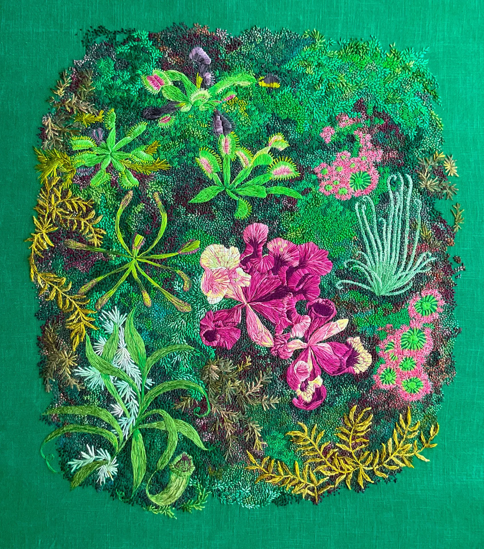 Original hand stitched botanical artwork, depicting a detailed selection of carnivorous plants. This artwork was inspired by the carnivorous plant exhibition, at the Calyx in Sydney’s Botanical Gardens. Made from cotton, wool and silk on linen, and framed in a dark timber box frame. This artwork was a finalist in the Fishers Ghost and Ravenswood Art Prize, and featured on the cover of Openbook Magazine in 2025.